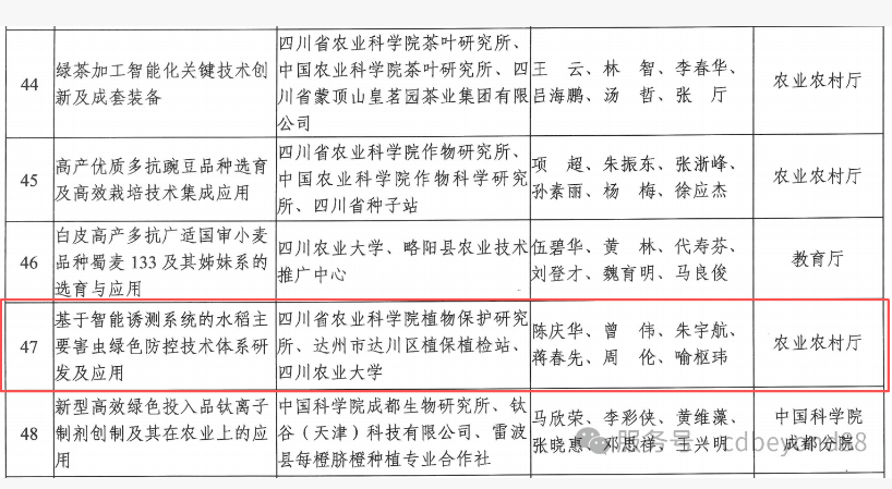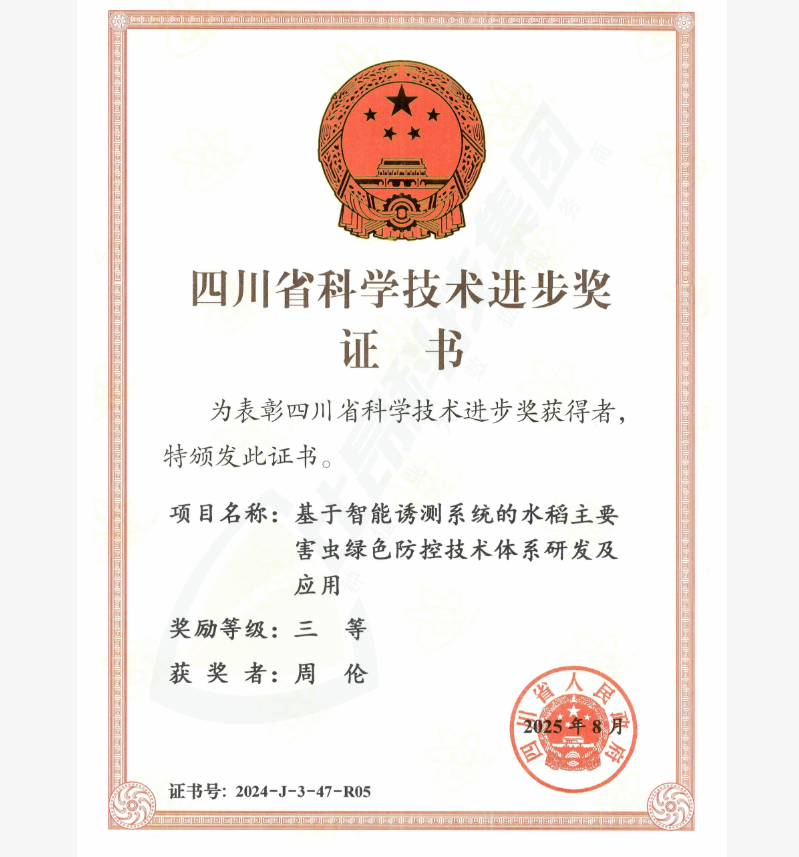 其中103个项目成果获得2024年度四川省科学技术奖,其中比昂科技受邀参与的项目-“基于智能诱测系统的水稻主要害虫绿色防控技术体系研发及应用”荣获四川省科学技术进步三等奖。