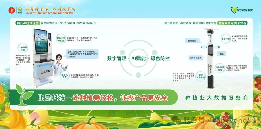 庆丰收主场活动现场设有天府新品种、天府新技术、天府新装备及智慧农业示范体验区,集中展示了农业新质生产力的重要成果。成都比昂科技有限公司(简称 “比昂科技”)作为深耕农业科技领域、以智能监测技术赋能乡村振兴,携新款复合光波智能杀虫器参展亮相。