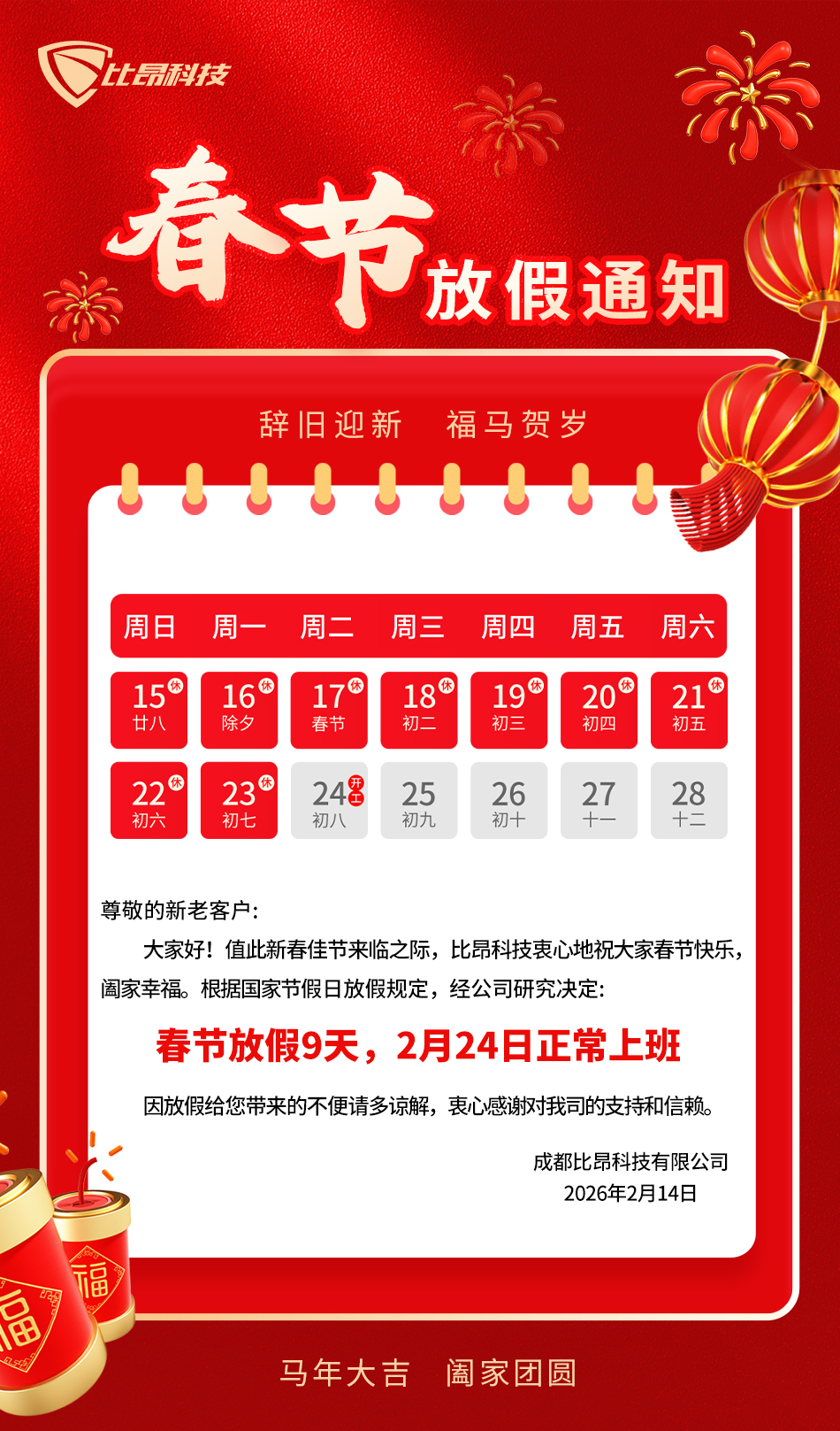 新春将至,共庆团圆!比昂科技向您致以最诚挚的节日问候,衷心感谢您对我们的信任与支持。每一份托付,我们都铭记于心,每一次携手,都是我们前行的动力。现将公司春节放假安排通知如下: