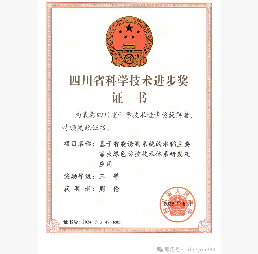 比昂科技始终秉持“农产品无农残威胁”的使命,借助科技力量赋能农业,在病虫害防控技术方面不断进行优化,公司受邀参与的项目“基于智能诱测系统的水稻主要害虫绿色防控技术体系研发及应用”,荣获四川省科学技术进步奖。