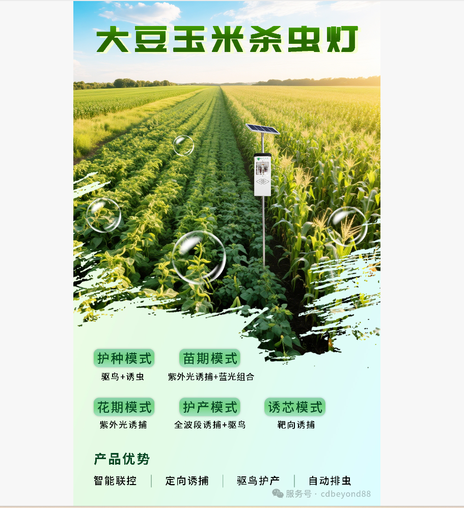 比昂科技新一代大豆玉米杀虫灯通过技术升级,为规模化种植主体提供“精准诱虫+智能管控+耐用易维+多效协同”的一体化解决方案。针对大豆和玉米的生长周期,我们推出集成声波和光波的双重驱鸟系统,在杀虫模式下可定时切换为驱鸟模式,有效减少鸟类对玉米果穗和大豆荚果的啄食,覆盖从播种到收获的各个阶段,确保作物健康生长。